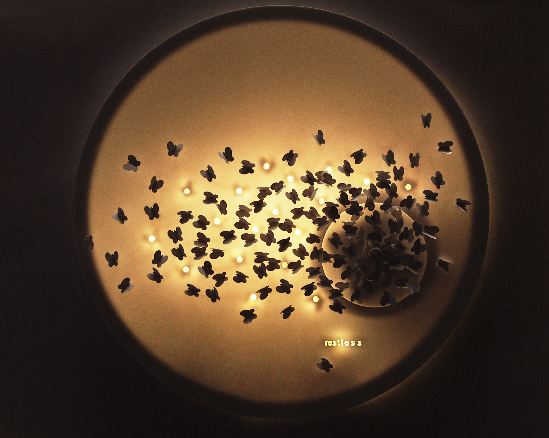 Designed to represent the feeling of “butterflies in your stomach”, this exploratory piece compliments my thesis project focusing on Anxiety Disorders. The butterflies suspended above the clocks surface emerge from the spinning second hand. The lighting behind the clock peers through the holes in the acrylic and highlights the darkness of the butterflies when exterior lighting is dimmed.